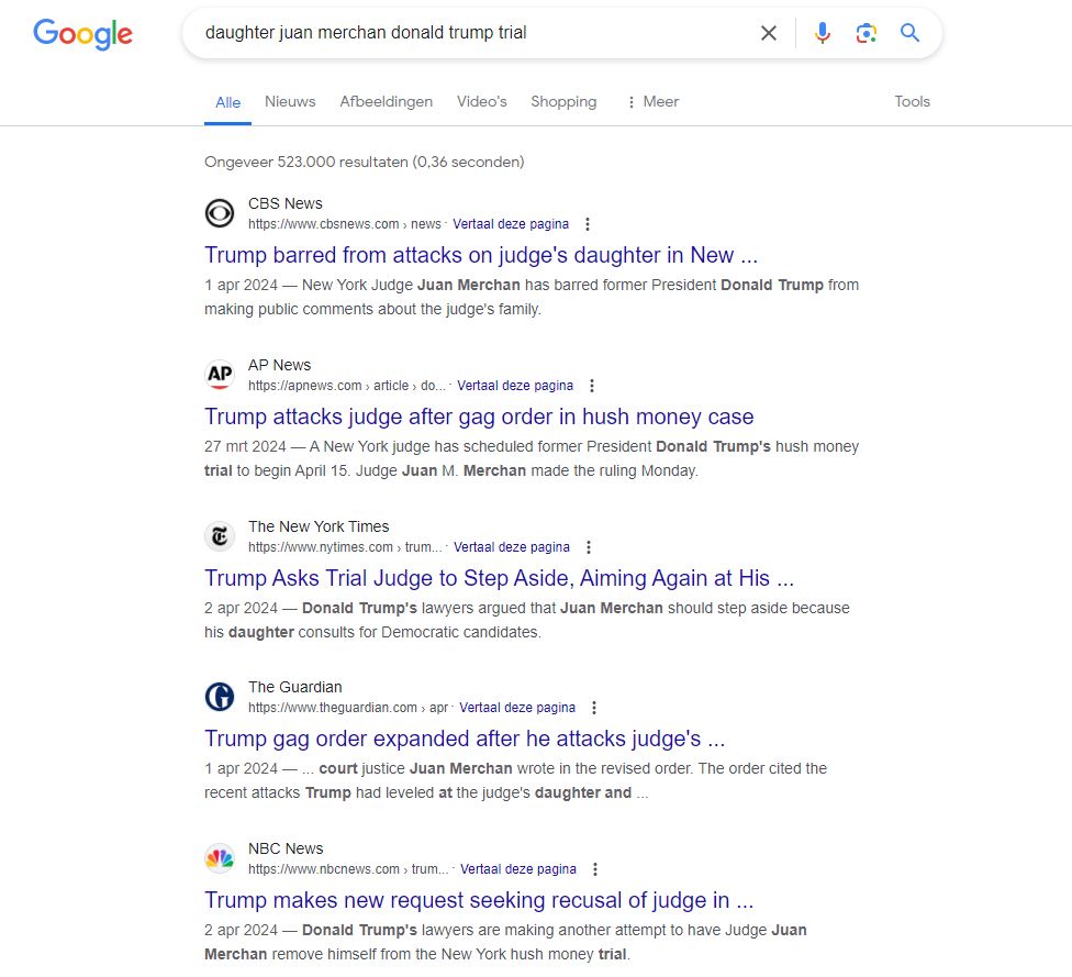 Let me give you one example: I wanted to find out how close the daughter of judge Juan Merchan in the Trump ‘Hush money’ trial (1) is to the Democratic Party. First I did a search on Google and got these results: