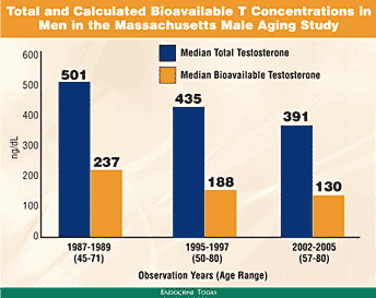On the internet I have come across an image (8) that says that the levels of testosterone have decreased with almost 50%. This is based on a 2007-study by Travisone et al. (3). When you compare the Median Total Testosterone (blue columns in the bar chart below) you see a decrease of 22% from people aged 45-71 in the eigthees to about the same age group in the 2000s.