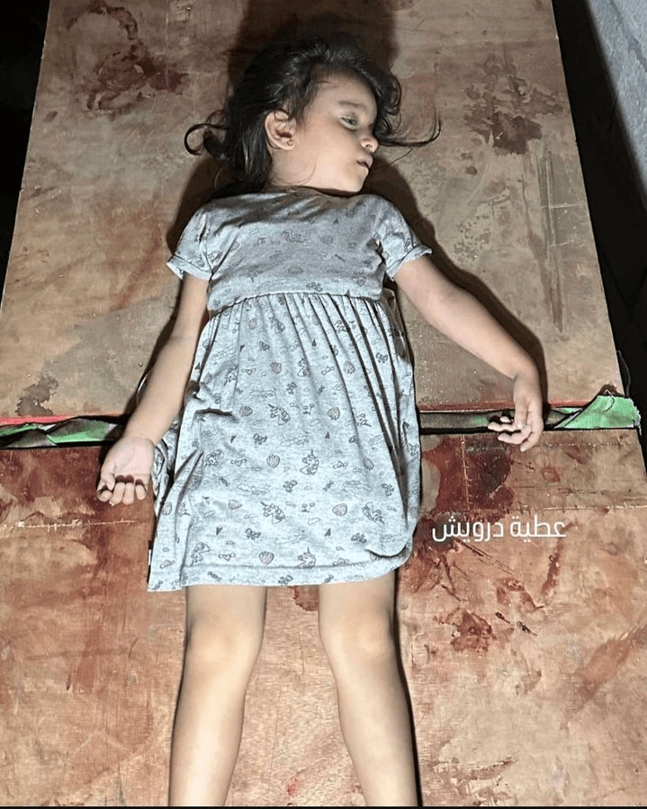 Four year-old Palestinian girl Rahaf Ziad Abu Suweirh was so terrified of the israeli bombing all around her in Nuseirat, her heart stopped #RIP (17)