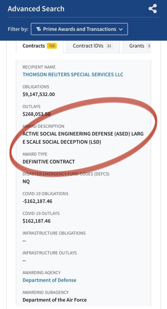 One of the questionable items that were found was related to a 9 million dollar investment from the Department of Defense for Reuters with rather suspicious sounding names like ‘Active Social Engineering Defense‘ and ‘Large Scale Social Deception‘ (6).