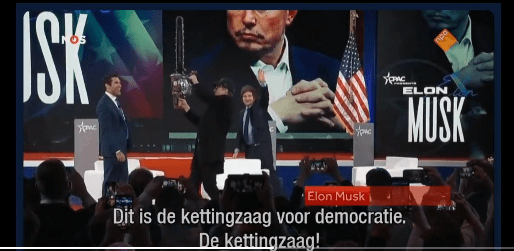 However, a rather bad translation ‘error’ occurred on Dutch TV. Instead of translating ‘bureacracy’ they translated it with the word ‘democracy’, suggesting that Musk was destroying democracy with this chainsaw.